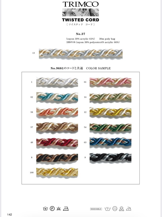 海外向けに作っていたツイストコードです。 再生産はありません。 直径 約9mm color 全10色 数量 1m 素材 レーヨン 31% アクリル(中芯) 69% made in japan モニター環境により、実際の商品の色合いと多少異なって見える場合があります。 予めご了承ください。